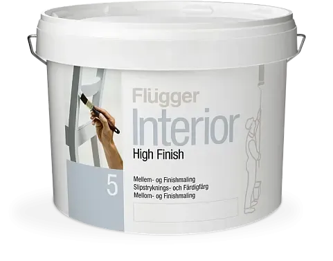 Flügger Interior High Finish 5 — водно-дисперсионная акриловая краска, подходящая как для базового, так и для заключительного слоя. Её применяют при оформлении межкомнатных конструкций, корпусной мебели и элементов интерьера. Поверхность после высыхания остаётся слабо блестящей и хорошо противостоит трению. Используется преимущественно в закрытых помещениях, но при соблюдении подготовительных мероприятий допустима и наружная работа.